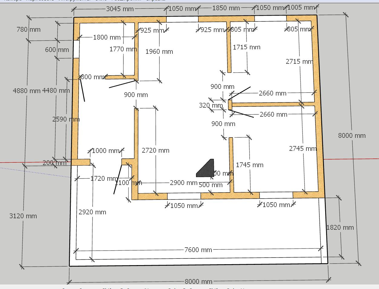 - Каркас стен: высота 2500 мм, толщина 150 мм; доска 50х150 мм;