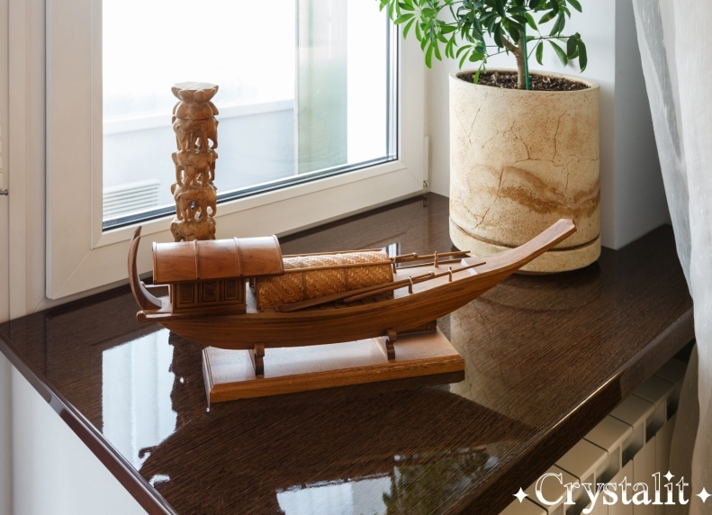 Посмотрите на фото подоконников Кристалит в интерьере. Идеально ровное глянцевое покрытие действительно наполнит светом и уютом Ваше окно и комнату, играя отраженным солнечными лучами. Теплая поверхность подоконника «Crystalit» приятна на ощупь, в отличие от холодного каменного. Элегантная и современная коллекция декоров подоконника «Crystalit» позволит по-новому взглянуть на оформление окна и открыть новые возможности в дизайне Вашей комнаты.