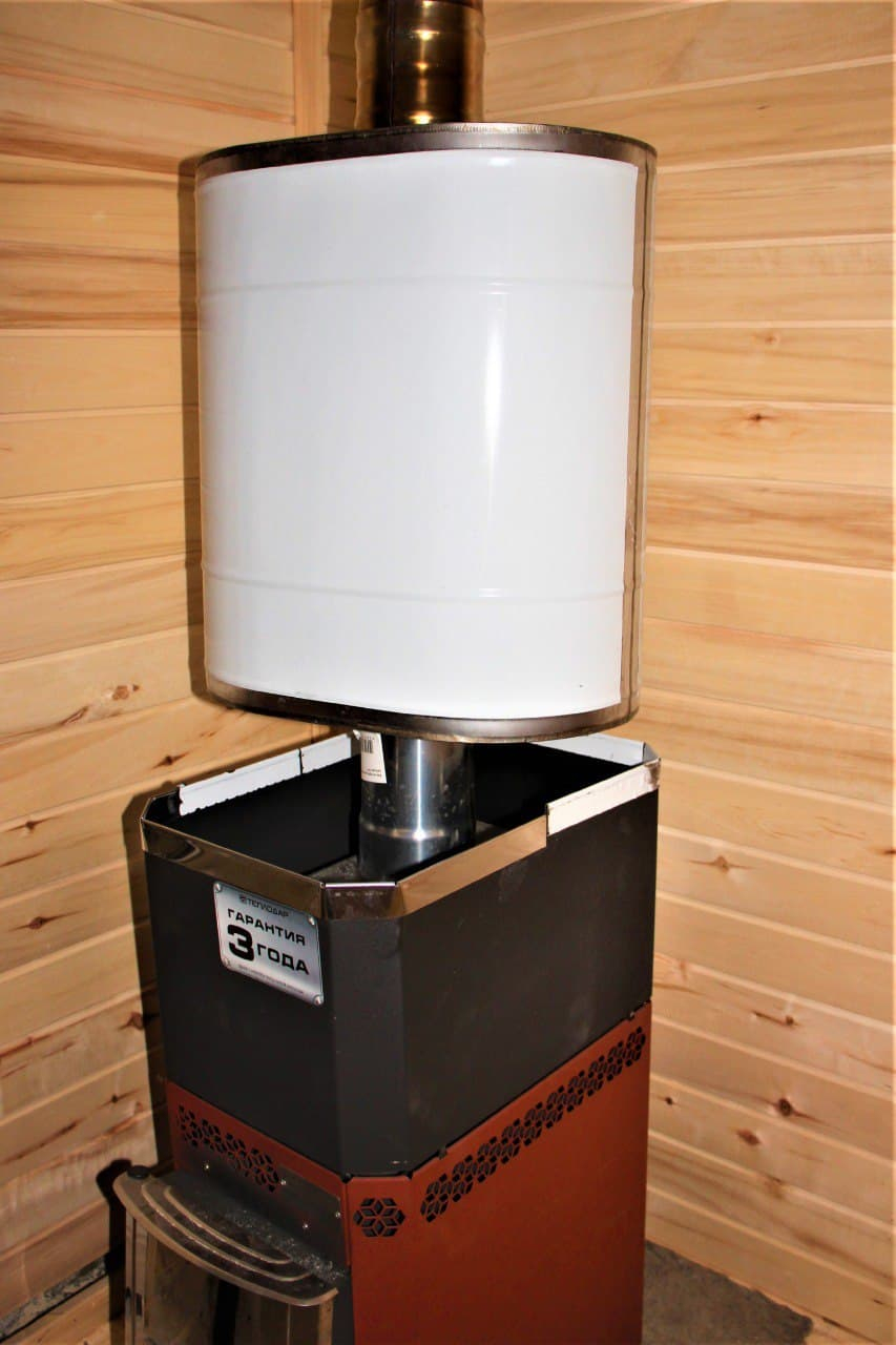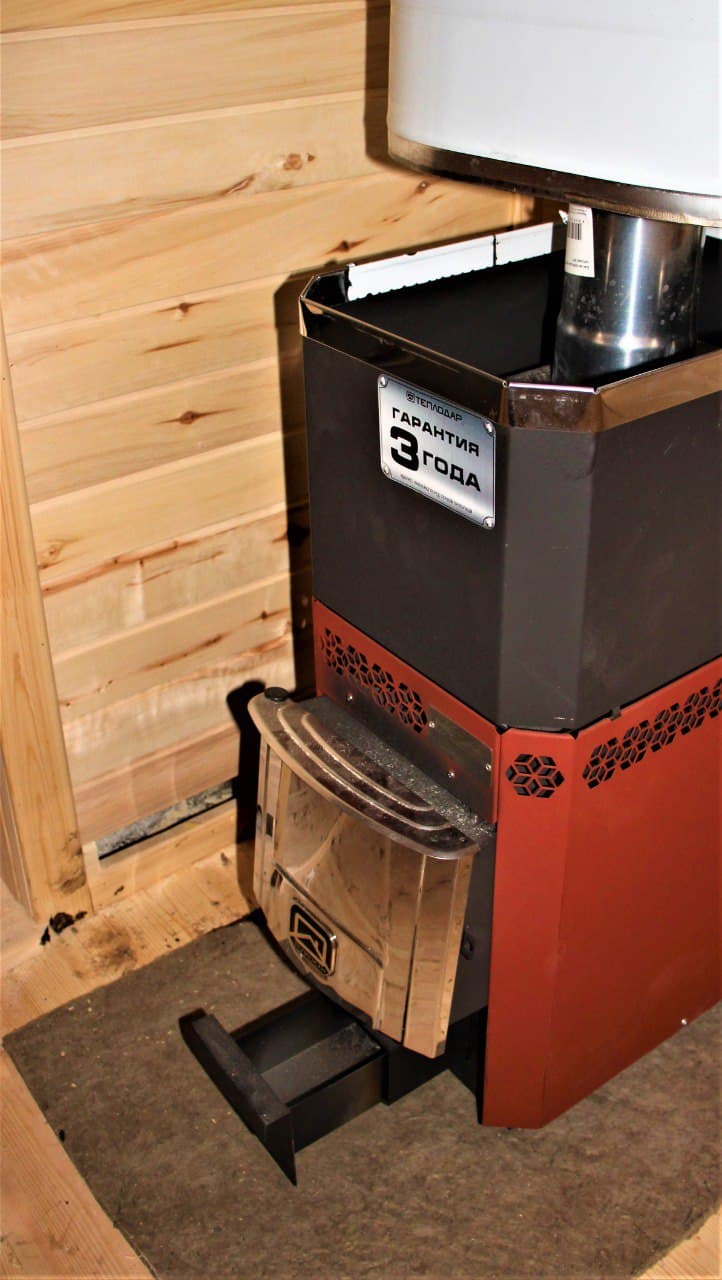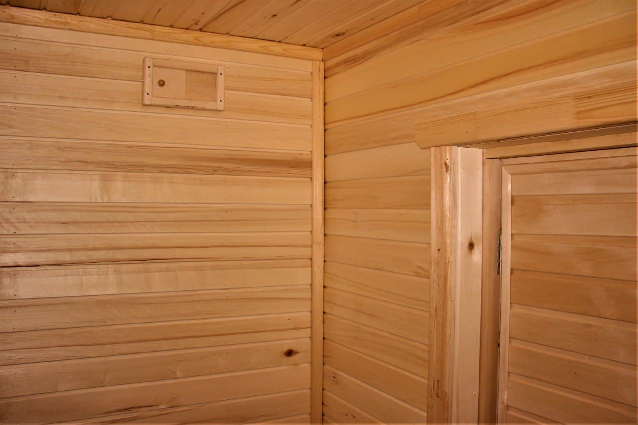 - Внутренняя обшивка стен: евровагонка сосна, сорт АВ; парилка — осина; комната отдыха — лист ГКЛ влагостойкий;
