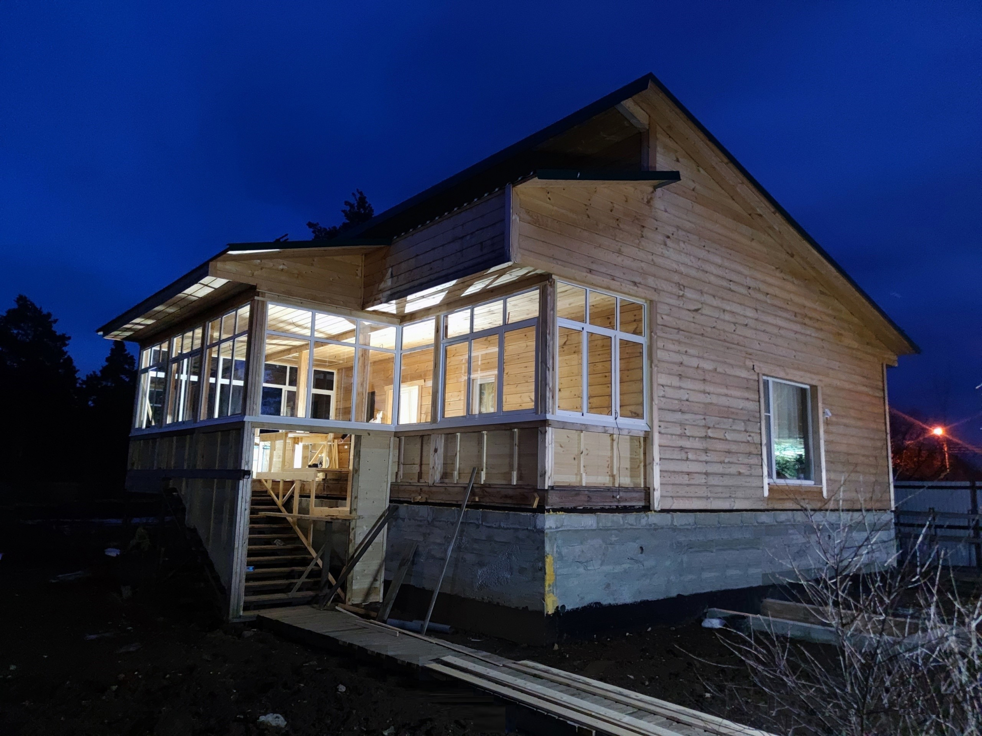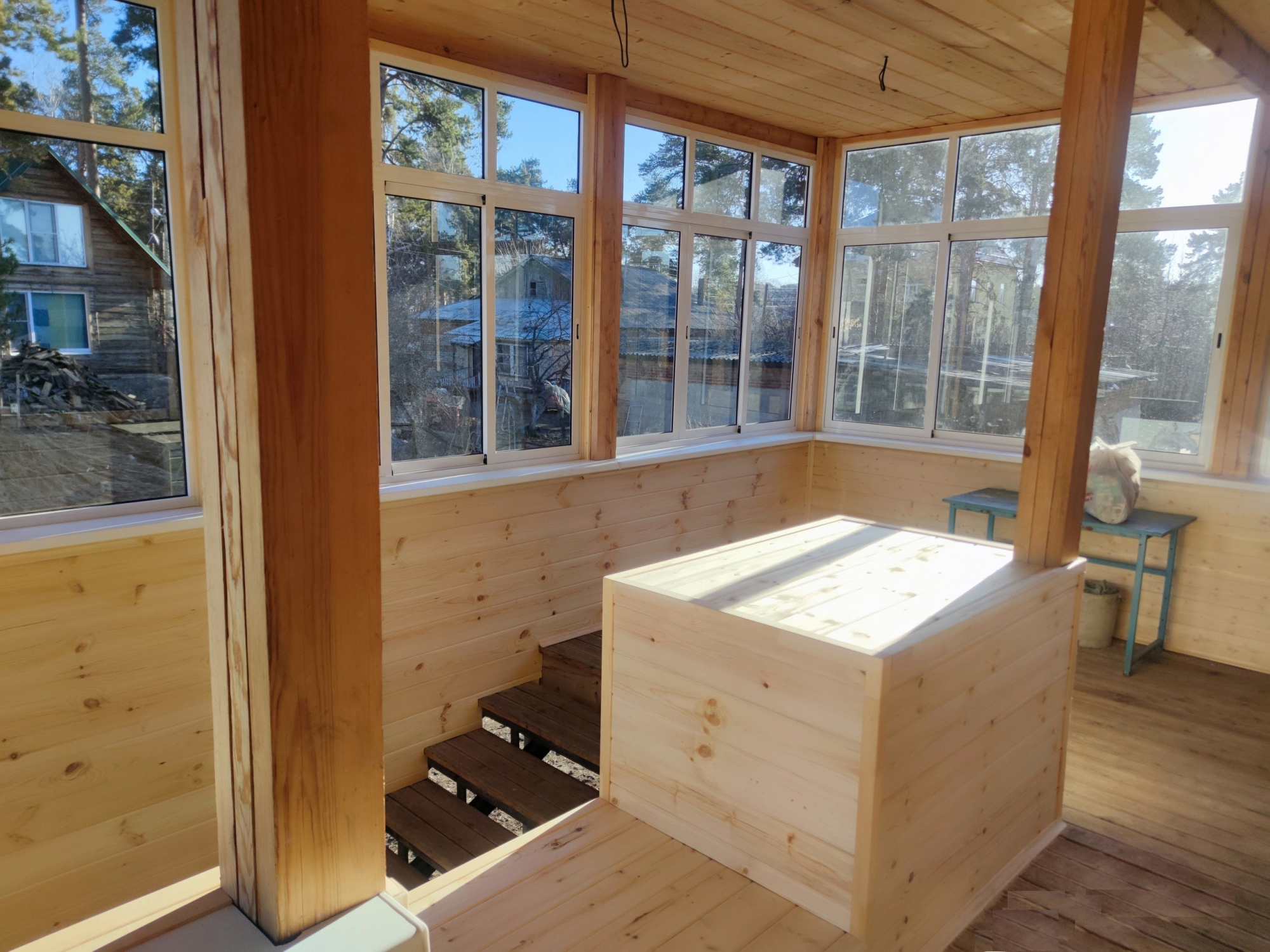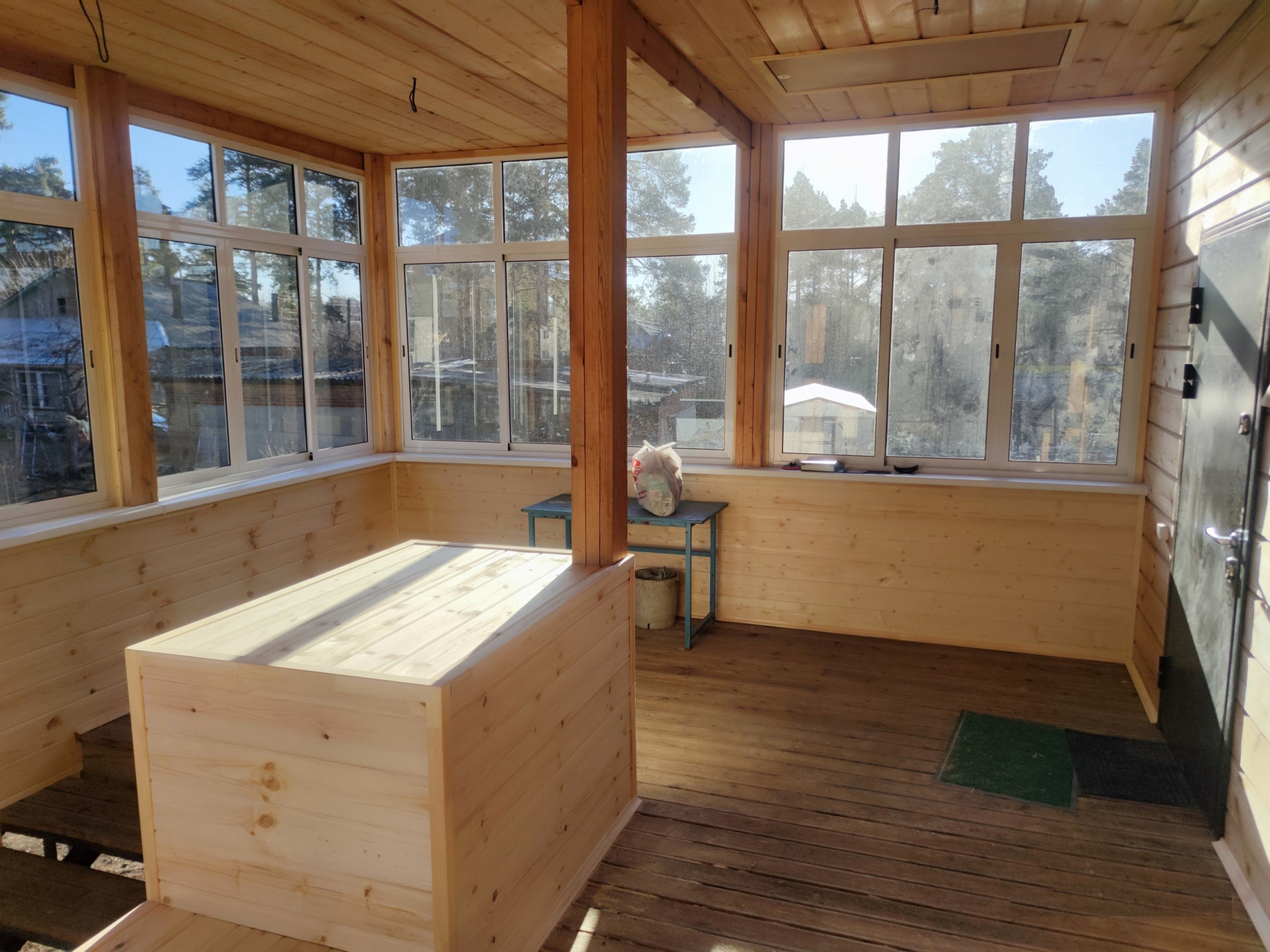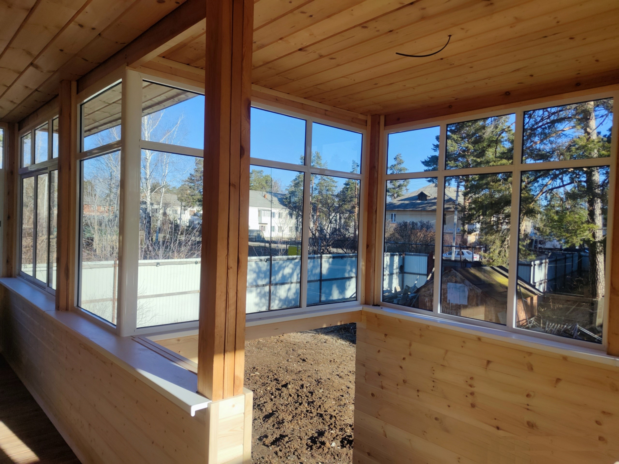 Для остекления веранды загородного дома выбраны раздвижные алюминиевые рамы. Высота конструкций - 1.8м, поэтому выполнено деление на верхнюю и нижнюю части посредством горизонтального импоста. Верхняя часть - глухая, нижняя - раздвижная. В загородном доме обязательны антимоскитные сетки. Ну если не обязательны, то рекомендуемы - однозначно.