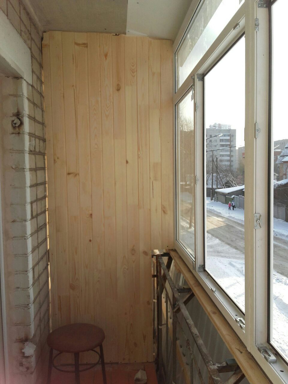 Внутренняя отделка выполнена деревом — вагонкой с сучком «А» класса. Впоследствии мы рекомендуем покрыть её средствами от выгорания и плесени, коих сейчас достаточно на прилавках. Приятная фактура дерева, немногочисленный и «живой» сучок, длительный и неприхотливый срок службы – достоинства отделки балкона деревом.
