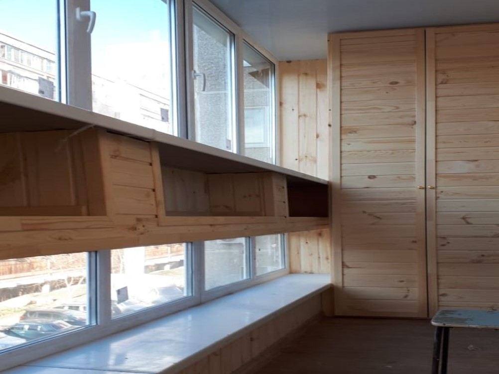 Итак, здесь у нас. Остекление – окна ПВХ с однокамерным стеклопакетом. Внутренняя отделка – евровагонка с сучком класса «А». По потолку – белая пластиковая панель. Фанерный пол застелен ламинатом, приобретенным заказчиком. И в завершении образа – два вместительных шкафа «в потолок» с распашными дверцами.