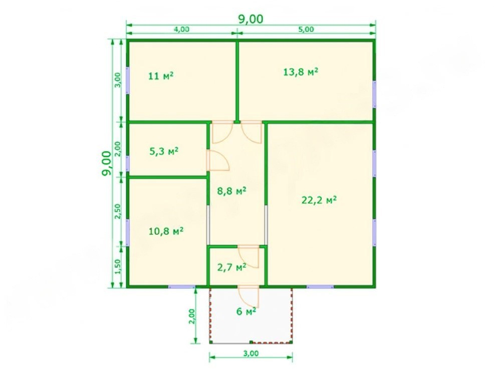 Проект каркасного дома 9х9м с крыльцом 2х3м